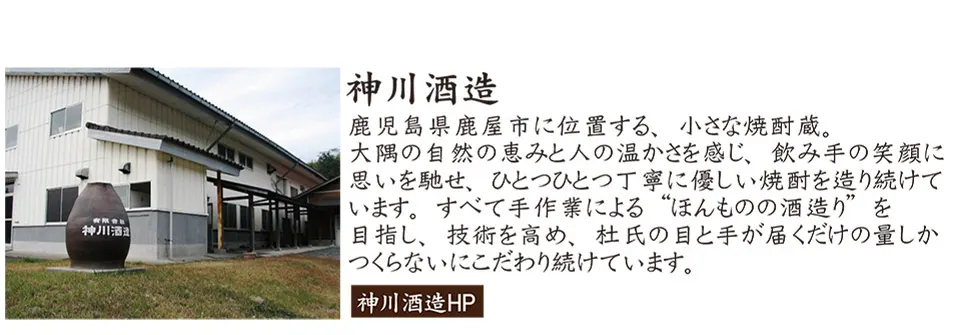 鹿児島県鹿屋市に位置する、小さな焼酎蔵。 大隅の自然の恵みと人の温かさを感じ、飲み手の笑顔に 思いを馳せ、ひとつひとつ丁寧に優しい焼酎を造り続けて います。